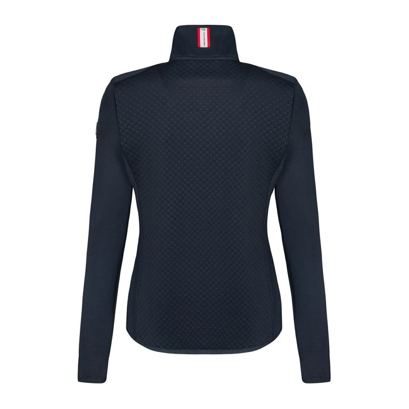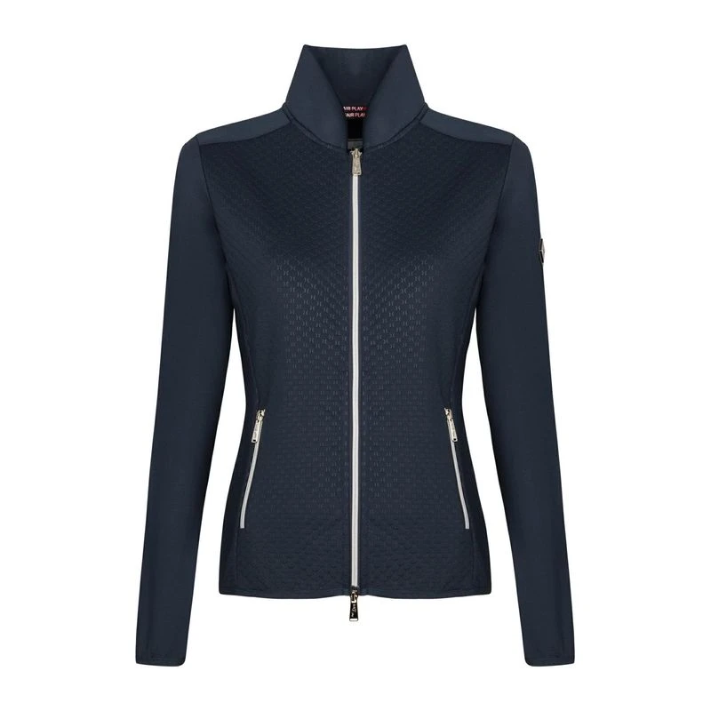This bi-stretch, full front zip sweat shirt has a stand up collar and sporty look. It has a fitted, feminine shape – size up if you want more room. The zipper is two way for ease in the saddle and the two side pockets are zippered – perfect for treats or cell phones.