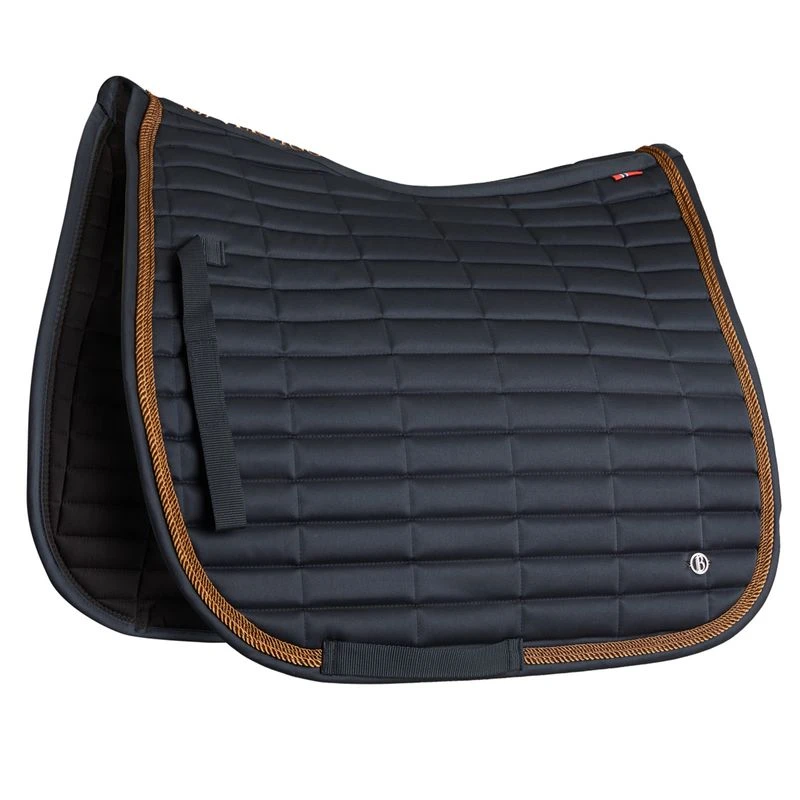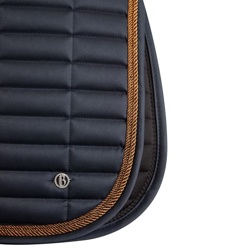 The B Vertigo Quinn saddle pad is made from high density material that perfectly cushions your movements. Quick-drying material wicks away any moisture. Rectangular quilting and three rows of cord around the edges make for a stunning look. The anatomically shaped spine brings a sporty touch. Pair this saddle pad with our B Vertigo Quinn ear net for a full look! Also available as all purpose version.