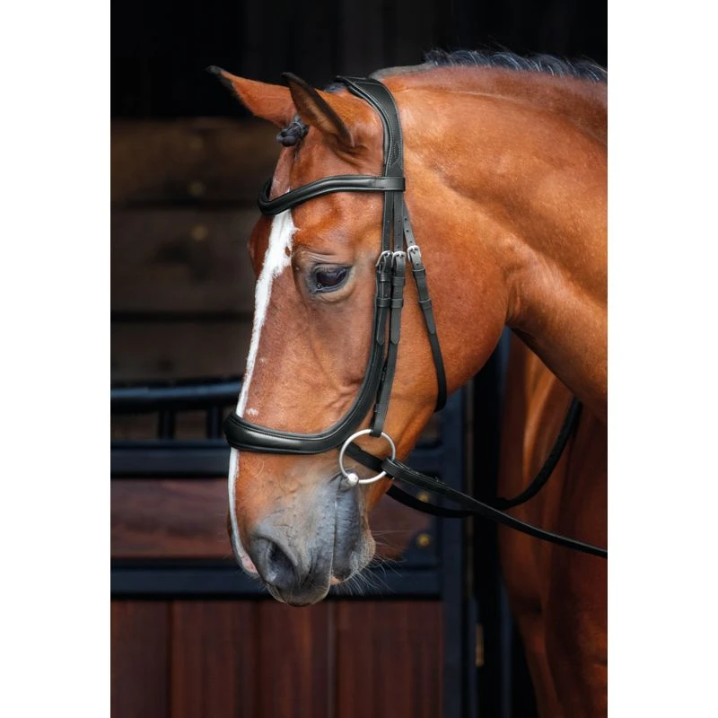 The unique flash position inhibits evasion of the bit without impeding airflow to the nose, promoting unrestricted breathing. Details include a FreedomFit headpiece designed to relieve pressure due to the wide, cushioned crown with poll gap and cutaway ear profile, soft leather combined with generous, anti-shock padding on the headpiece, browband, and noseband, elegant profile due to a sleek, angled throatlatch, high shine stainless steel harness buckles, and signature Velociti reins for a flexible and reliable grip.