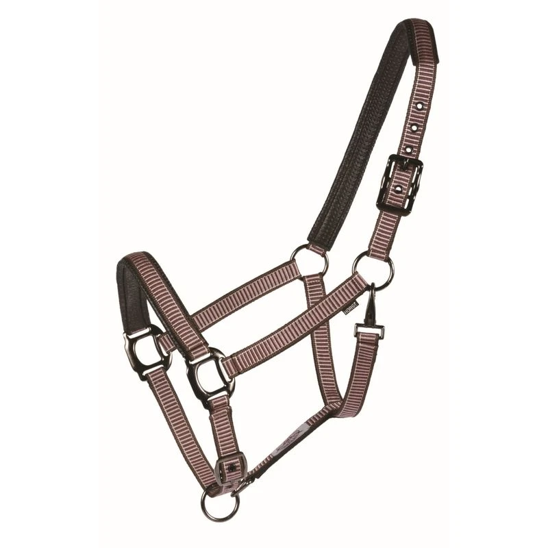 Stylish polypropylene web halter featuring contrasting stripes, shiny black hardware and PVC padding on crown and nose.